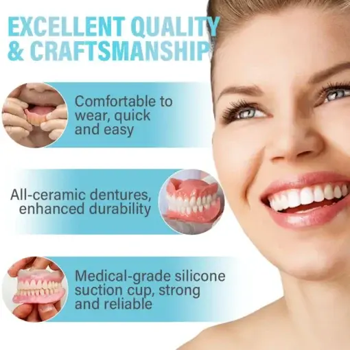 🌟 Easy Fit, Seamless Comfort: Enjoy dentures that adapt perfectly to your mouth from the moment you put them on. Our cutting-edge design ensures a snug and secure fit, providing exceptional comfort that feels like a natural part of your mouth. You can go about your day with confidence, free from discomfort or shifting, allowing you to eat, speak, and smile without any hassle or worry.