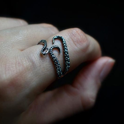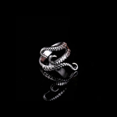 I’d been shopping around for a ring like this after seeing one online I liked, and I’m really happy I went with this one! It’s well-made and comfortable, and there’s no need to know your ring size because the design makes it very easy to adjust up or down. Sterling silver is a hypo-allergenic material, so this ring would be a good choice for anyone who likes the style. The ring I received is stamped with the 925 imprint marking it as real Sterling silver, and it has no rough edges or imperfections at all. The only difference between the product photo and the actual is that the oxidized detail between the suckers on the tentacles is a bit lighter than it appears in the photos – but it still shows off the details in the ring with the contrast, and looks clean and nicely finished. It even comes in a giftable velvet pouch!