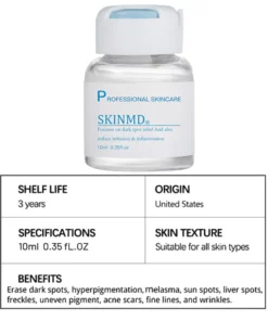 “SKINDM® Dark Spot And Acne Treatment Unisex Liquid is the product delivering the safest and fastest results of eliminating dark spots and acne outside of plastic surgery like laser treatment. We have found that it has helped 95% of users to successfully eliminate dark spots and acne through long-term follow-up records. It works to inhibit the formation of melanin and bacterial growth, and fade already-formed spots and acne scarring.