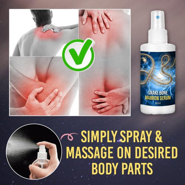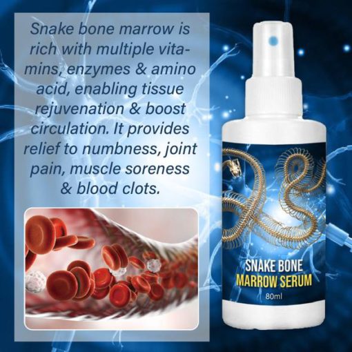 Snake Bone Marrow Serum is a pain relieving, warming spray to be used on the skin. It is recommended for the relief of pain in muscles, tendons, joints or bones, lower back and thigh pain, sprains or strains.