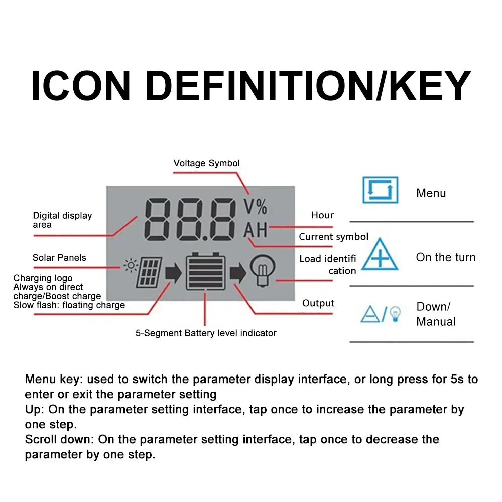 3. This controller is only applicable to all kinds of lead-acid batteries (including open, sealed, colloidal, etc.), do not use on other batteries (including lithium batteries, nickel-metal hydride batteries, etc.)
