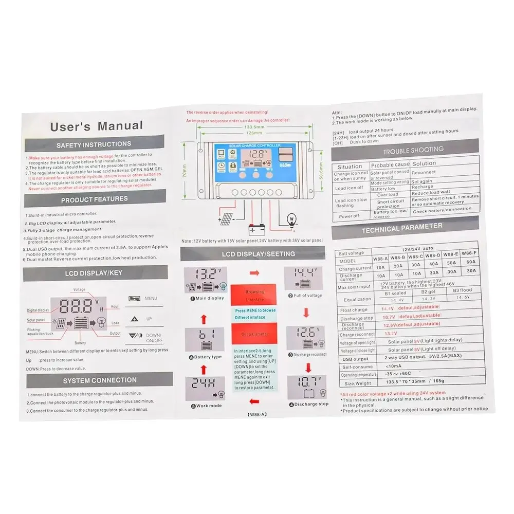 1. This controller is 12V/24V automatic adaptation, when you first install, please make sure that the battery has enough voltage, so that the controller can recognize the correct battery type.