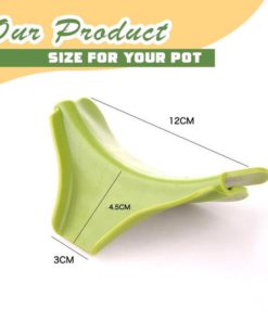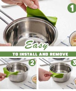 This was a good combination of products and are easy to store together. I’ve already used both. I like that they are silicone and will resist heat well. Now I can get rid of the sharp-edged stainless steel flat drainer I bought earlier. (I was afraid I’d burn or cut myself on that one. Not a problem with this green clip on one. ) I tried it on a very small saucepan and a skillet and it held on OK.