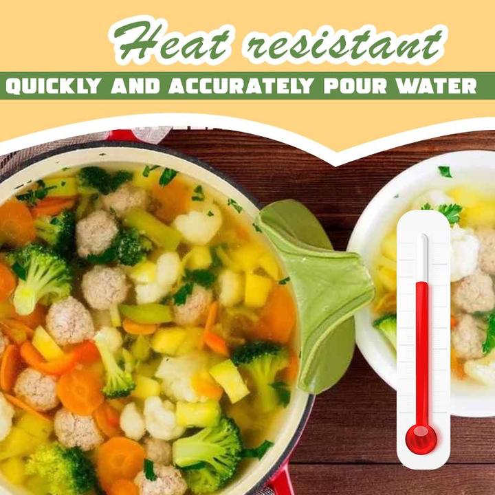 Soup Silicone Funnel has a CURATIVE DESIGN that PERFECTLY FITS MOST of the ROUND POTS, PANS, BOWLS of ALL SIZES. PERFECT for ACCURATELY POURING Water, Soup, Sauce, Liquids, and more. It is PERFECT for BOTH COLD and HOT. EASY to WASH and CLEAN.