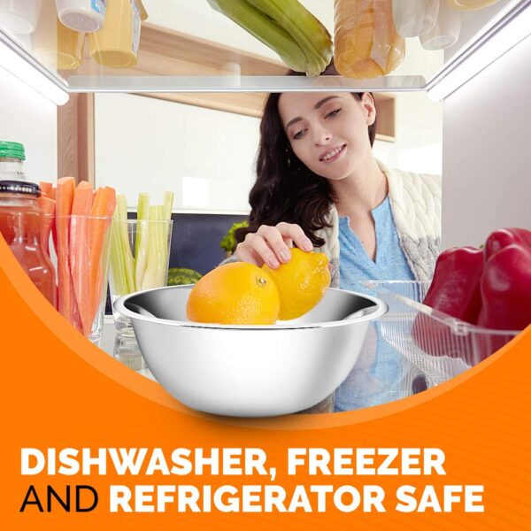 Our fridge and freezer safe kitchen bowls are easy to clean by hand and are dishwasher safe! It is ideal for your different needs such as making salads, mixing desserts, cooking dough, preparing meals, whisking eggs, storing vegetables and fruits. The hand-polished stainless steel surface can withstand daily scratches, corrosion and discoloration.