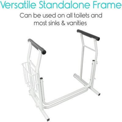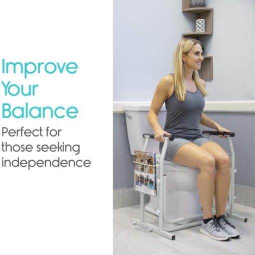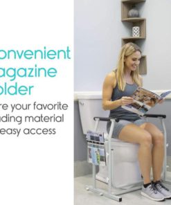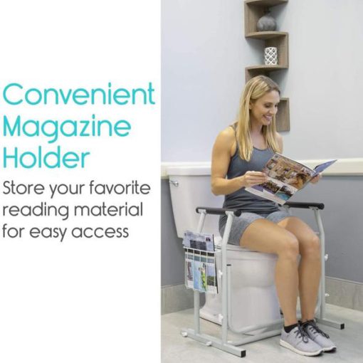 New and high quality Comes with convenient magazine rack Freestanding around toilet to fit both standard and elongated seat toilets Comes with padded armrests for added comfort Easy