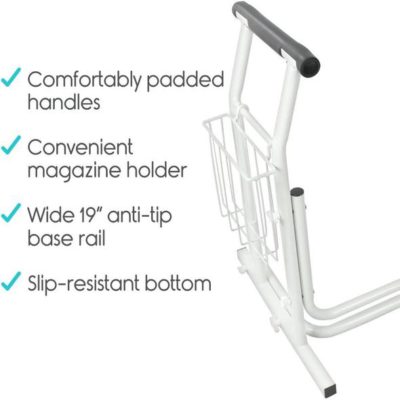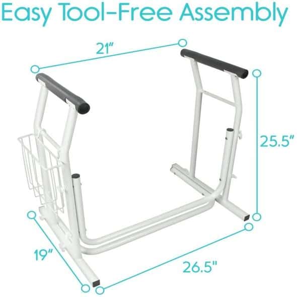 The freestanding toilet rail is easy to assemble: no tools required. Rail handles are padded with soft foam for pain-free support. The foam padding creates a comfortable, non-slip surface for a secure grip when sitting or standing.