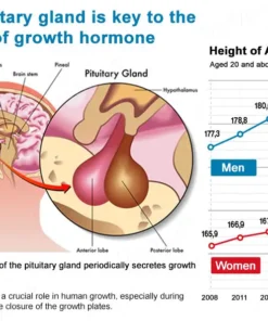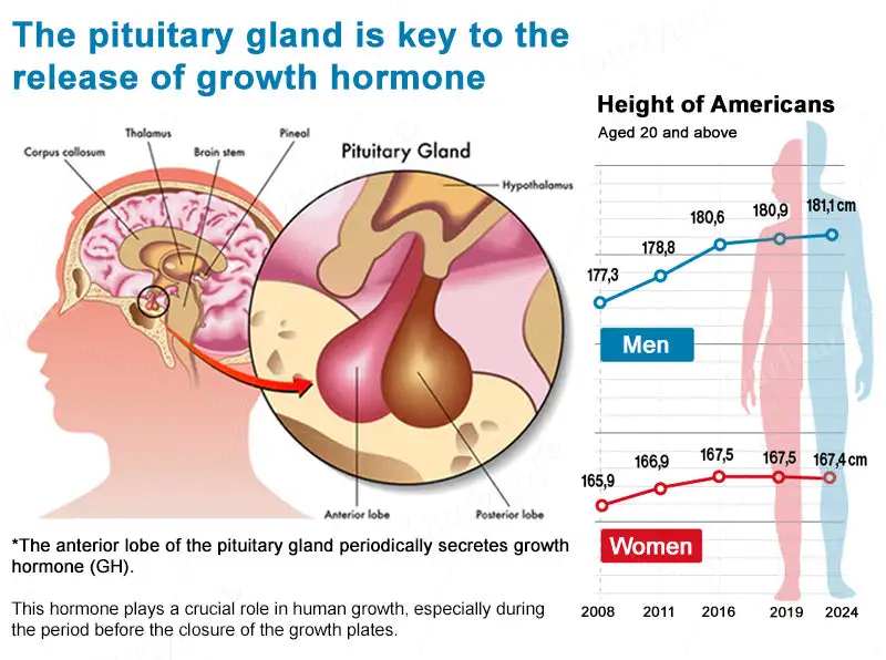 Height growth depends primarily on growth hormone (HGH) secreted by the anterior pituitary at the base of the brain—especially during puberty, when HGH is crucial for bone development and elongation. As we age, HGH secretion naturally declines, and once the growth plates close in adulthood, further height increases become much harder to achieve.