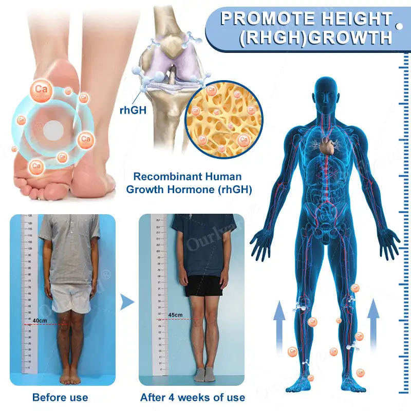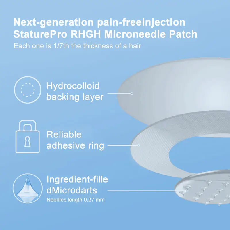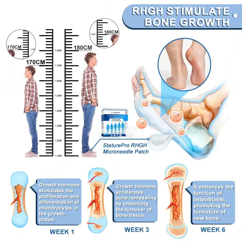 Each micro-needle in the Nano Micro-Needle Patch contains rHGH. The way it works is by mimicking the natural growth hormone (HGH) produced by the anterior pituitary during human development. It effectively targets the growth plates in bones, stimulating the proliferation and elongation of bone cells, which leads to an increase in height.