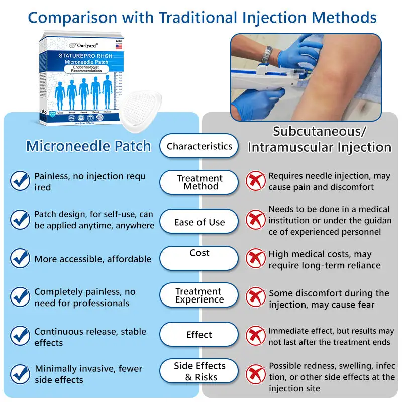 Ourlyard® rHGH Nano Micro-Needle Patch releases the medication slowly and steadily over time, ensuring stable effects for 24 hours without causing discomfort. With the same dosage and price, it can maintain its effectiveness for up to 20 times longer (similar to the difference between IV infusions and single injections). Its micro-needle design ensures that the growth hormone is absorbed evenly and efficiently into the bloodstream, fully activating the body’s growth potential.