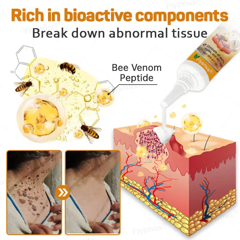 Flysmus® Tag Recede Bee Venom Treatment Cream provides a solution by harnessing the potent properties of bee venom to target various skin irregularities such as skin tags, moles, warts, and blemishes. Enriched with active ingredients from bee venom, this advanced formula works to break down and gently remove unwanted growths.