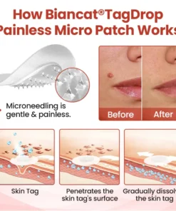 Biancat® TagDrop utilizes advanced dissolvable MicroDart technology to deliver active ingredients directly to the root of skin tags — in a way that is painless, non-invasive, and suitable for sensitive skin.
