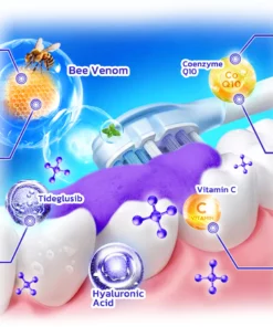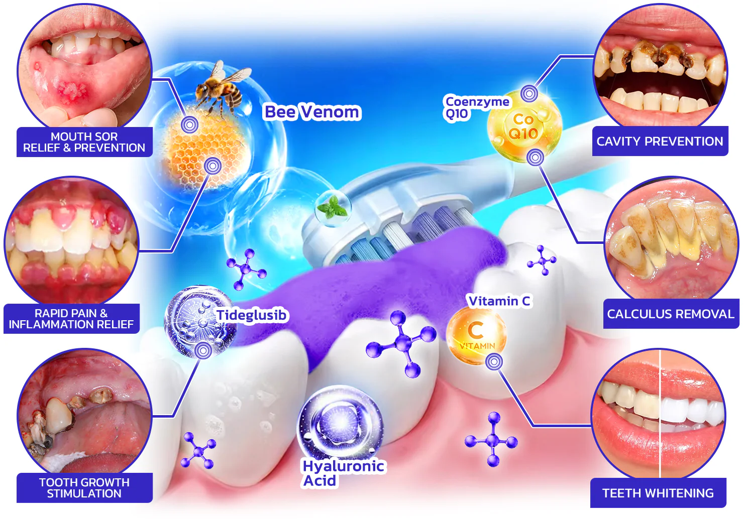 It effectively eliminates 99.99% of bacteria, freshens breath, removes plaque and tartar, treats gingivitis and periodontitis, relieves toothaches, prevents cavities, restores enamel, stimulates dentin formation, and supports tooth regeneration. Infused with bee venom and natural anesthetics, it effectively reduces symptoms of gingival inflammation, easing discomfort and promoting gum healing. This fast-acting formula reduces swelling, redness, and sensitivity, providing immediate relief.