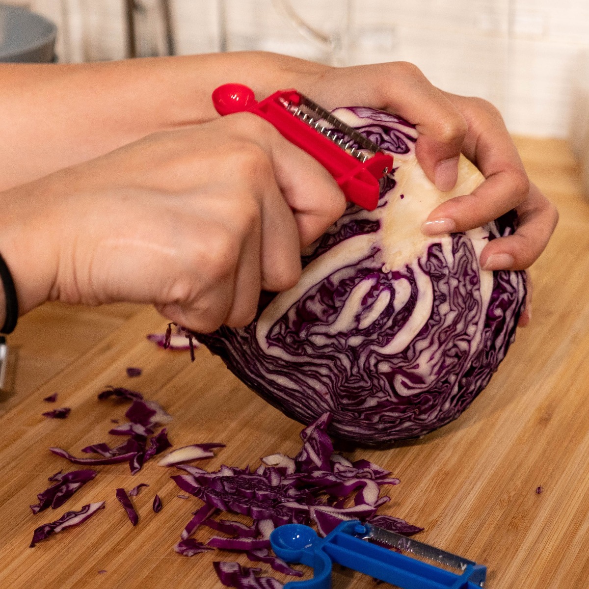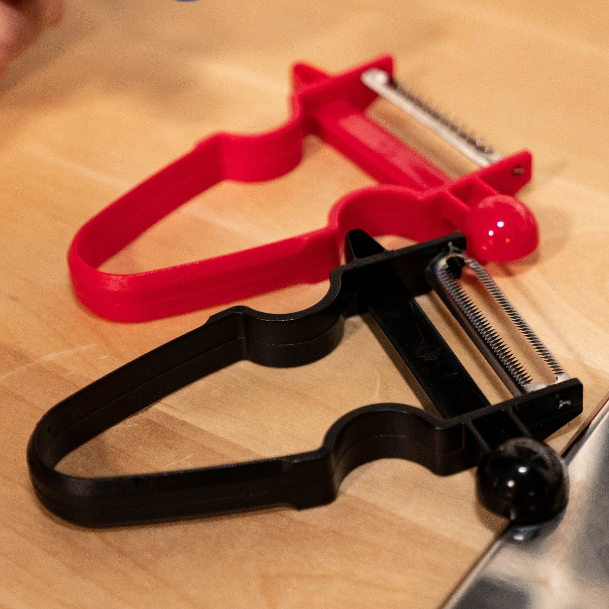 - Peels any fruit or vegetable and even slices small blocks of cheese