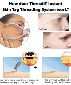 ThreadIT Instant Skin Tag Threading System will cut off the blood supply to the skin tag. Without a supply of blood, the cells die, and the tag falls away. This process is known as threading system. Threading System is known for its antimicrobial properties, so the thread will not become infected with potentially infectious bacteria.