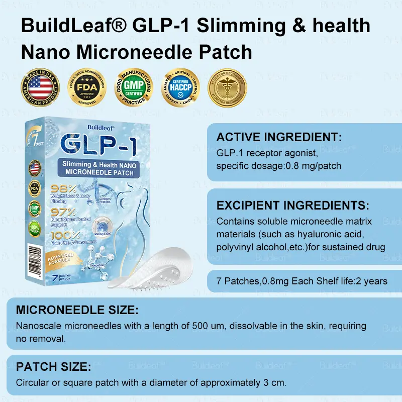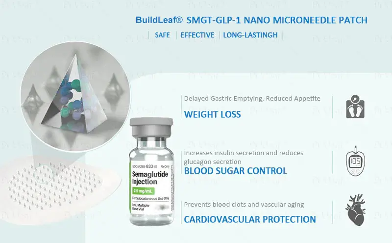 The Buildleaf® Tirzepatide Nano Microneedle Patch offers a long-lasting. slow release of the medication. ensuring a stable effect over 24 hours without causing any discomfort. With the same dosage and price. it can maintain up to 20 times longer-lasting effects (similar to the difference between an IV drip and a single injection).