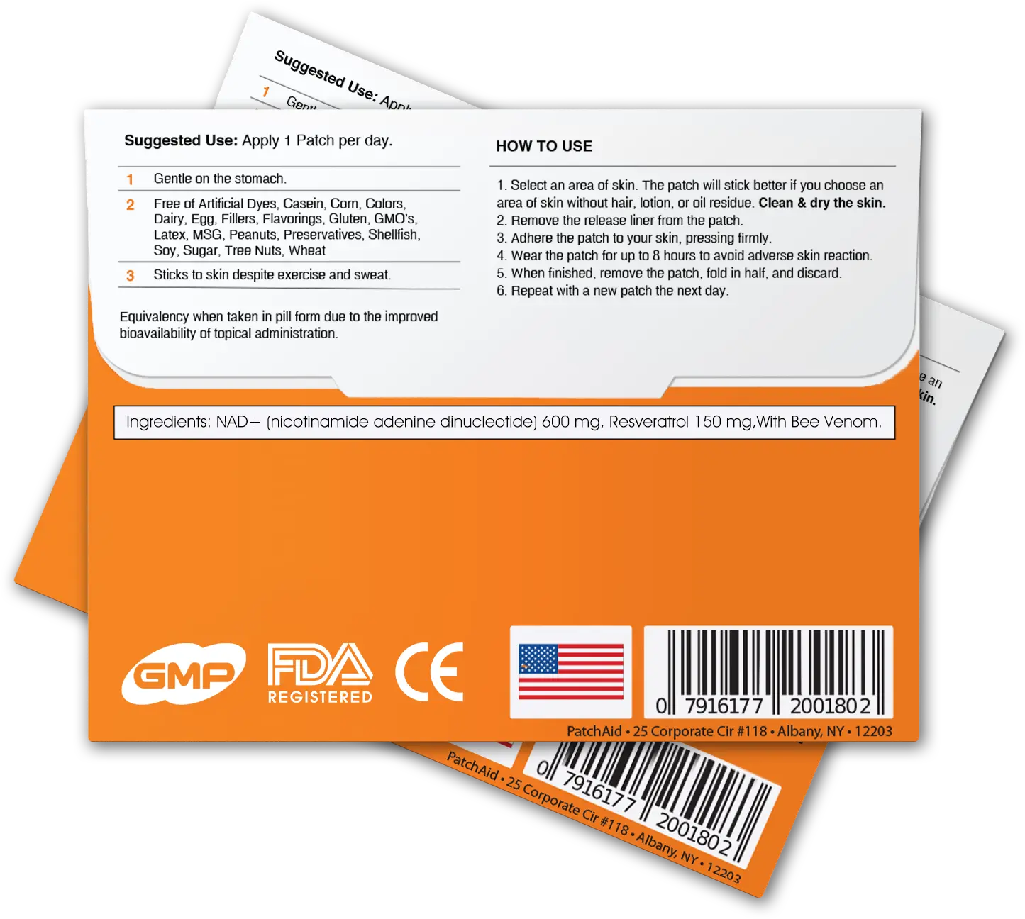 All NAD+ & Bee Venom Patches are free of Artificial Dyes. Casein. Corn. Colors. Dairy. Eggs. Fillers. Flavorings. Gluten. GMOs. Latex. MSG. Peanuts. Preservatives. Shellfish. Soy. Sugar. Tree Nuts. and Wheat.