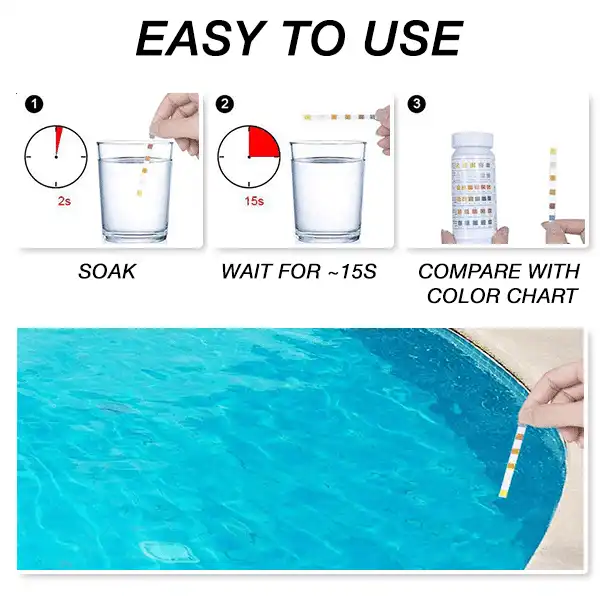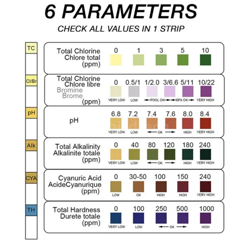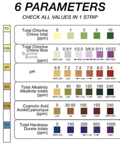 - With an easy-to-read color chart, you can identify up to 6 parameters (Total Chlorine, Free Chlorine, Bromine, pH, Total Alkalinity, Cyanuric Acid, Total Hardness) of test solutions within 1 minute. Let’s take pH as a reference to keep the water fresh and sparkling clean!