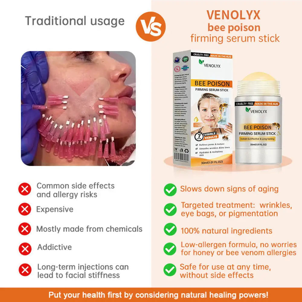 The creation of VENOLYX® bee poison Firming Serum Stick stems from the factors of collagen loss and hormonal imbalance, which contribute to skin concerns like wrinkles, aging, sagging, and fat accumulation. By incorporating this product into your routine, you can effectively address issues such as stretch marks, wrinkles, and sagging skin, while enhancing the appearance of your abs, breasts, and buttocks. Moreover, it aids in tightening loose skin and offers various other advantages. Rest assured, VENOLYX® bee poison Firming Serum Stick is crafted from 100% natural ingredients, ensuring both the safety of your skin and the provision of a high-quality product.