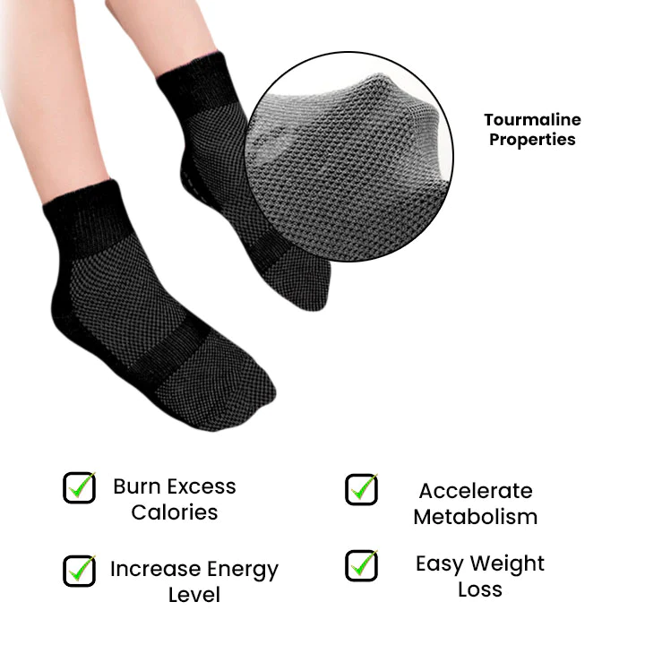 The tourmaline properties of the socks do not only target the natural acupressure points, it also releases negative ions that transmit heat deep into the body, forcing the body to burn more calories. Tourmaline has multiple benefits such as decreasing gastrointestinal blockages, increasing satiation and decreasing cravings, improves lymphatic flow, improves detoxification and bowel movements and many more which can really improve your weight loss journey.