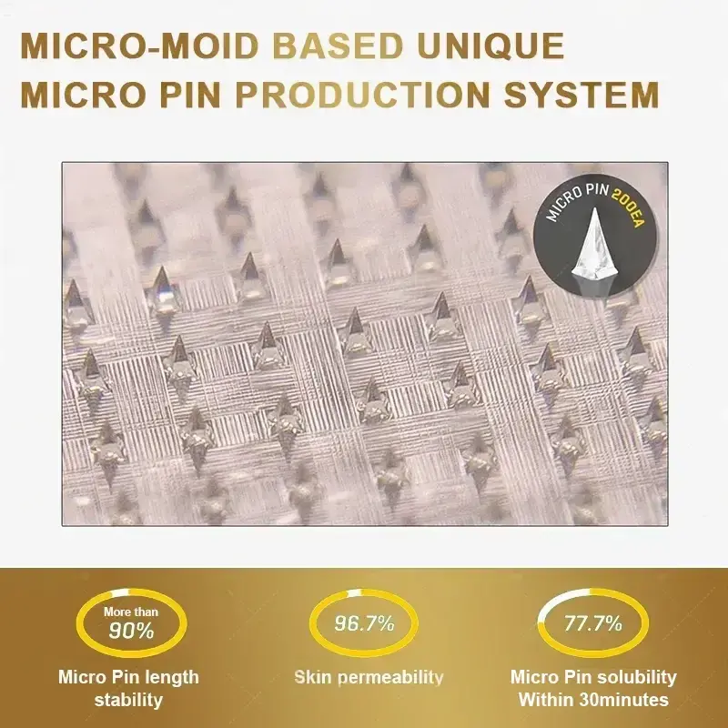 Each needle is 0.27mm long. just 1/7th the thickness of a hair. and is made from dissolvable medication. These micro-needles are precision-engineered using cutting-edge manufacturing techniques to ensure a seamless. pain-free experience while effectively delivering the active ingredients directly into the skin.