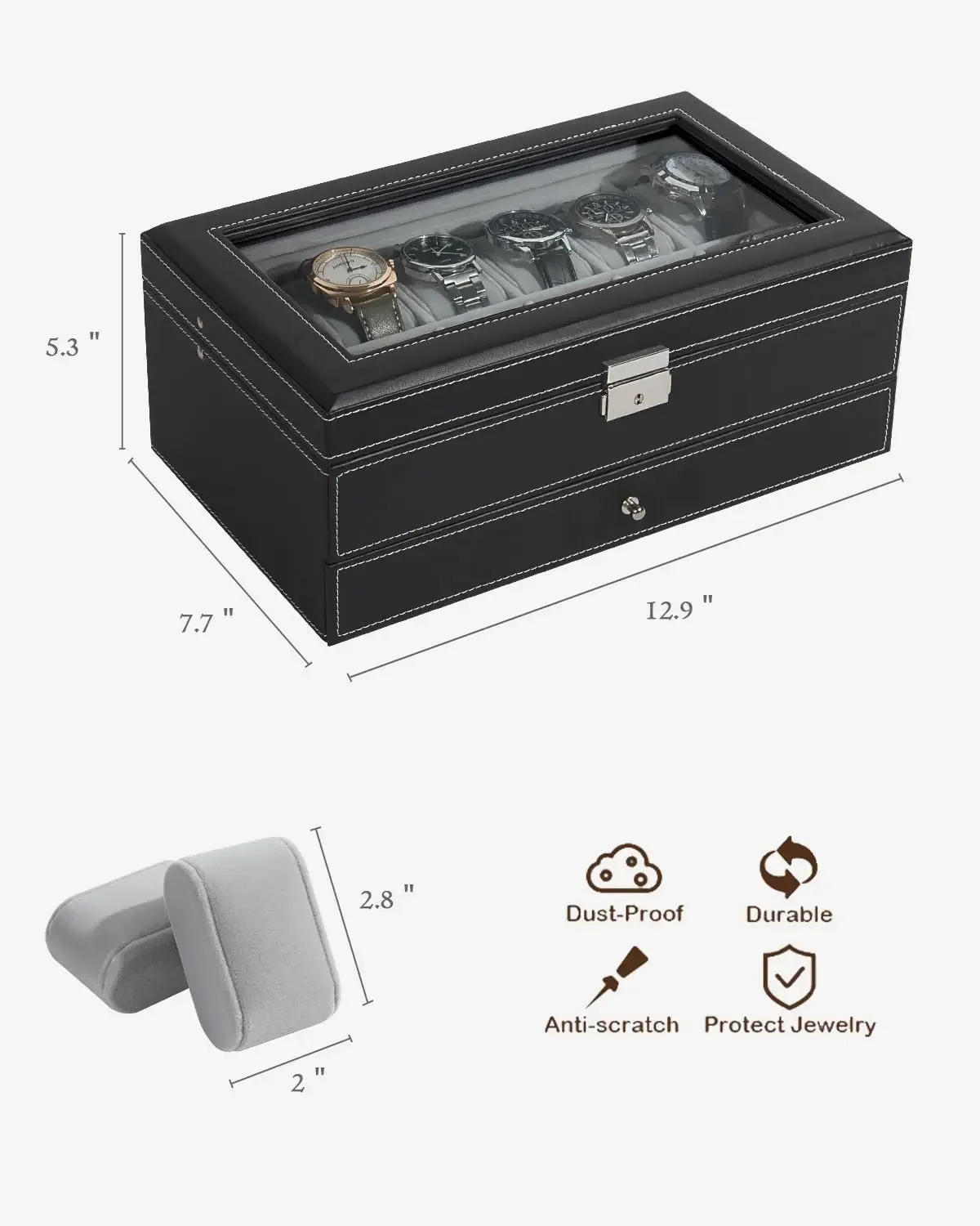 12 Slot PU Leather Lockable Watch Storage Boxes, Men &; Women’s Jewelry Display Drawer Case, 2-tier Organizer Watch Showcase Box