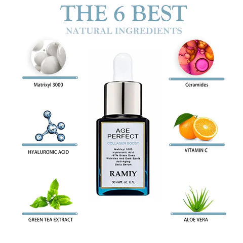 The Ramiy™ Age Perfect Collagen Boost Anti Aging Serum effectively increases Ceramides levels and increases the rate of skin metabolism. Our product will help on returning firmness and elasticity more effectively. You will see and feel your skin becoming firmer, more elastic and less saggy over time. It also repairs and supports protection from the sun and other free radical damage for a combined result of a naturally lighter and more youthful complexion.