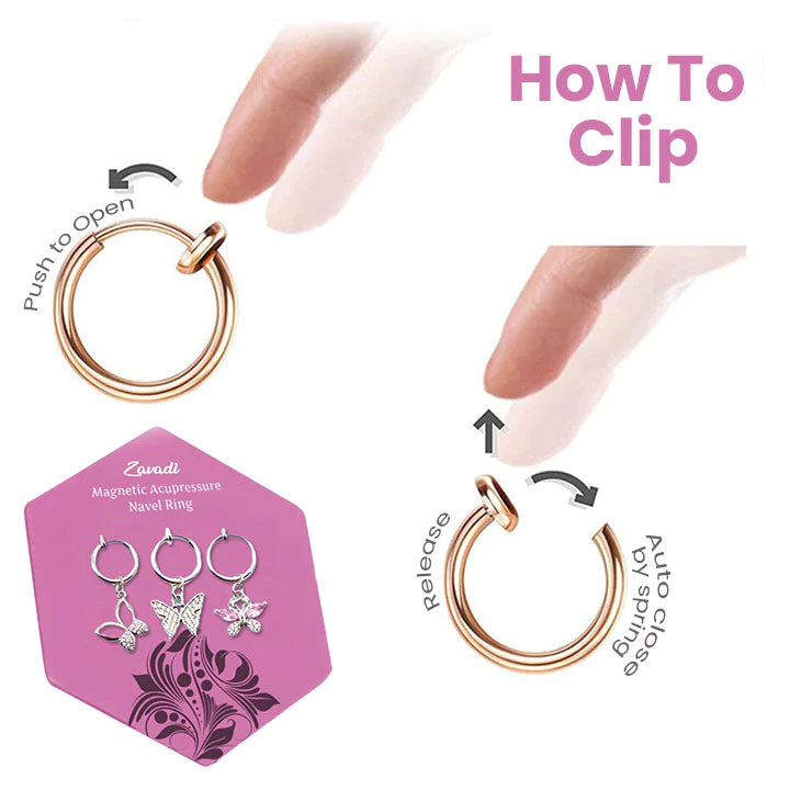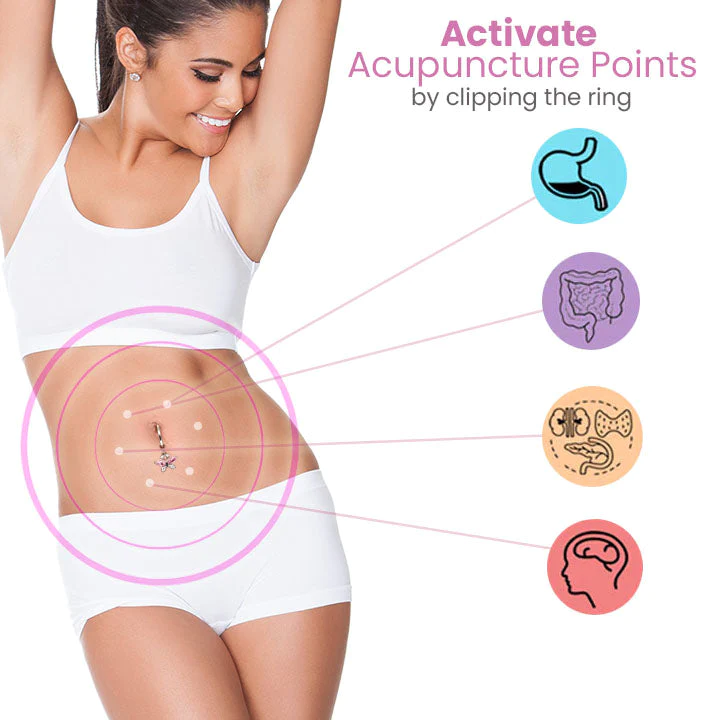 Pressure applied to the navel might activate acupuncture points. By clipping the Navel ring it automatically applied pressure to activate the acupoints that can help stimulate your digestive system and improve your blood flow.