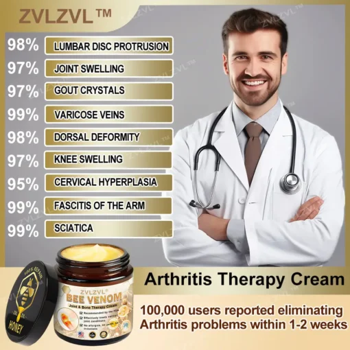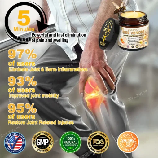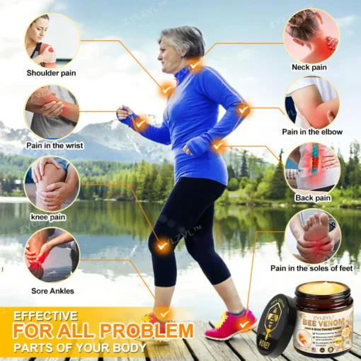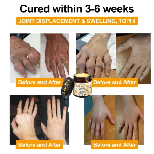 Combining bee venom, curcumin, resveratrol, omega-3 fatty acids, and other powerful ingredients, this cream provides rapid relief for conditions like synovitis, bursitis, tendonitis, frozen shoulder, and ankylosing spondylitis. It effectively reduces swelling, pain, and stiffness in various joints, including fingers, knees, wrists, and hips.